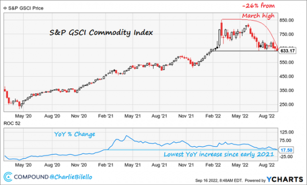 With the recent decline in the price of crude oil per barrel, but especially industrial metals and agricultural commodities, the S&P GSCI has reached its lowest level since the beginning of the Russian invasion of Ukraine. The index is now down 26% from its peak in March.